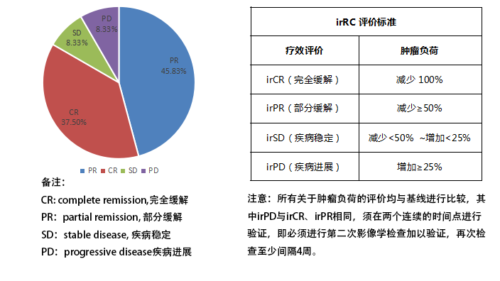 总结 :在统计的24例患者中,综合评价指标缓解的占83.33%(其中完全缓解占37.5%,部分缓解占45.83%),稳定的占8.33%,疾病进展的占8.33%。