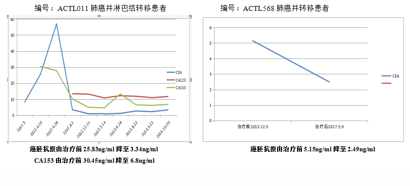 注:从上述患者的血清肿瘤标志物变化中,可以看到经ACTL治疗后许多患者出现血清肿瘤标志物上升,后下降的现象。下降同时出现瘤负荷量明显降低。