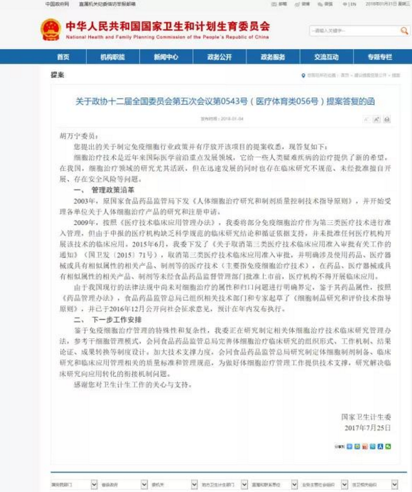 鉴于免疫细胞治疗管理的特殊性和复杂性,我委正在研究制定相关体细胞治疗技术临床研究管理办法,参考干细胞管理模式,会同食品药品监管总局完善体细胞治疗临床研究的组织形式、工作机制、结果论证、成果转换等制度设计。加大技术支撑力度,会同食品药品监管总局研究制定体细胞制剂制备、临床研究和临床应用管理相关的质量标准和管理规范,为实行体细胞治疗管理工作给予技术支撑,研究解决临床研究向应用转化的衔接机制问题。